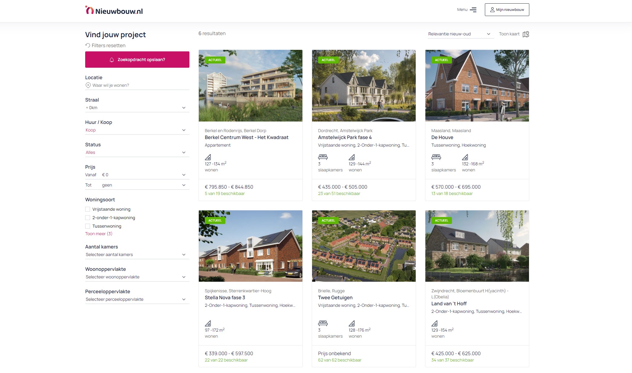 Als partner dragen wij actief bij aan het bevorderen van nieuwbouw in het hele land door nauw samen te werken met alle betrokken partijen. Ons doel is om Nieuwbouw.nl uit te laten groeien tot dé plek voor iedereen die geïnteresseerd is in nieuwbouw, met volledige toegang tot alle nieuwbouwprojecten en gerelateerde informatie. We vinden het belangrijk dat Nieuwbouw.nl gratis toegankelijk is voor alle gebruikers, mede mogelijk gemaakt door de gezamenlijke inspanningen van alle betrokken partijen.