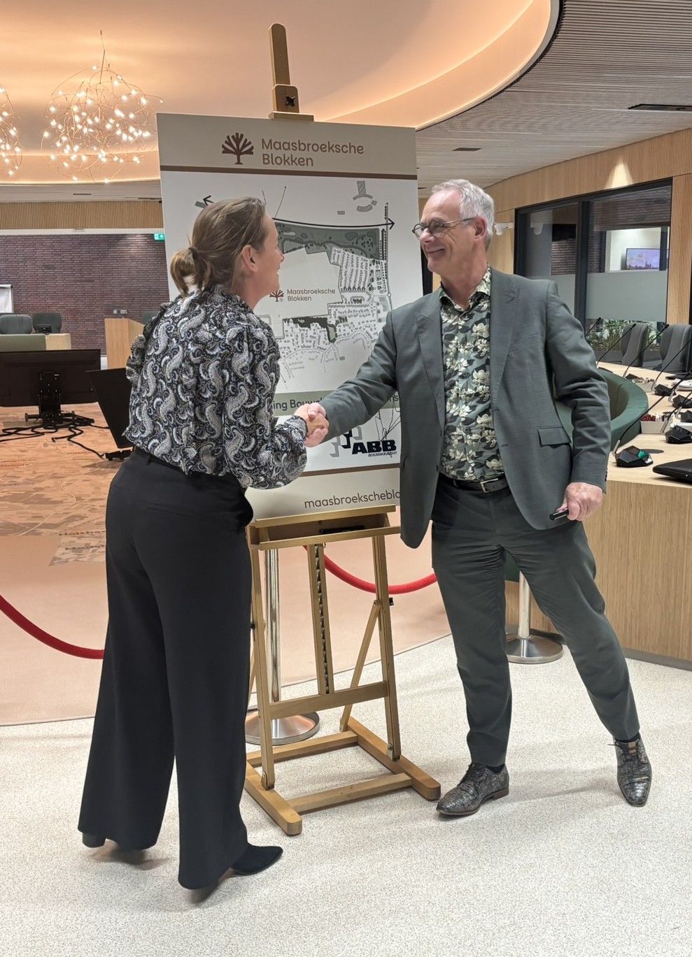 De bouw van het grootste woningbouwproject van gemeente Land van Cuijk – Maasbroeksche Blokken – is een stap dichterbij. Woensdag 3 december ondertekenden wethouder Bouke van Vught namens het college van gemeente Land van Cuijk en Jan Dekker, directeur Ontwikkeling van ABB de bouwclaimovereenkomst waarin afspraken zijn vastgelegd over het vervolg van deze megawijk van zo’n 23 hectare.