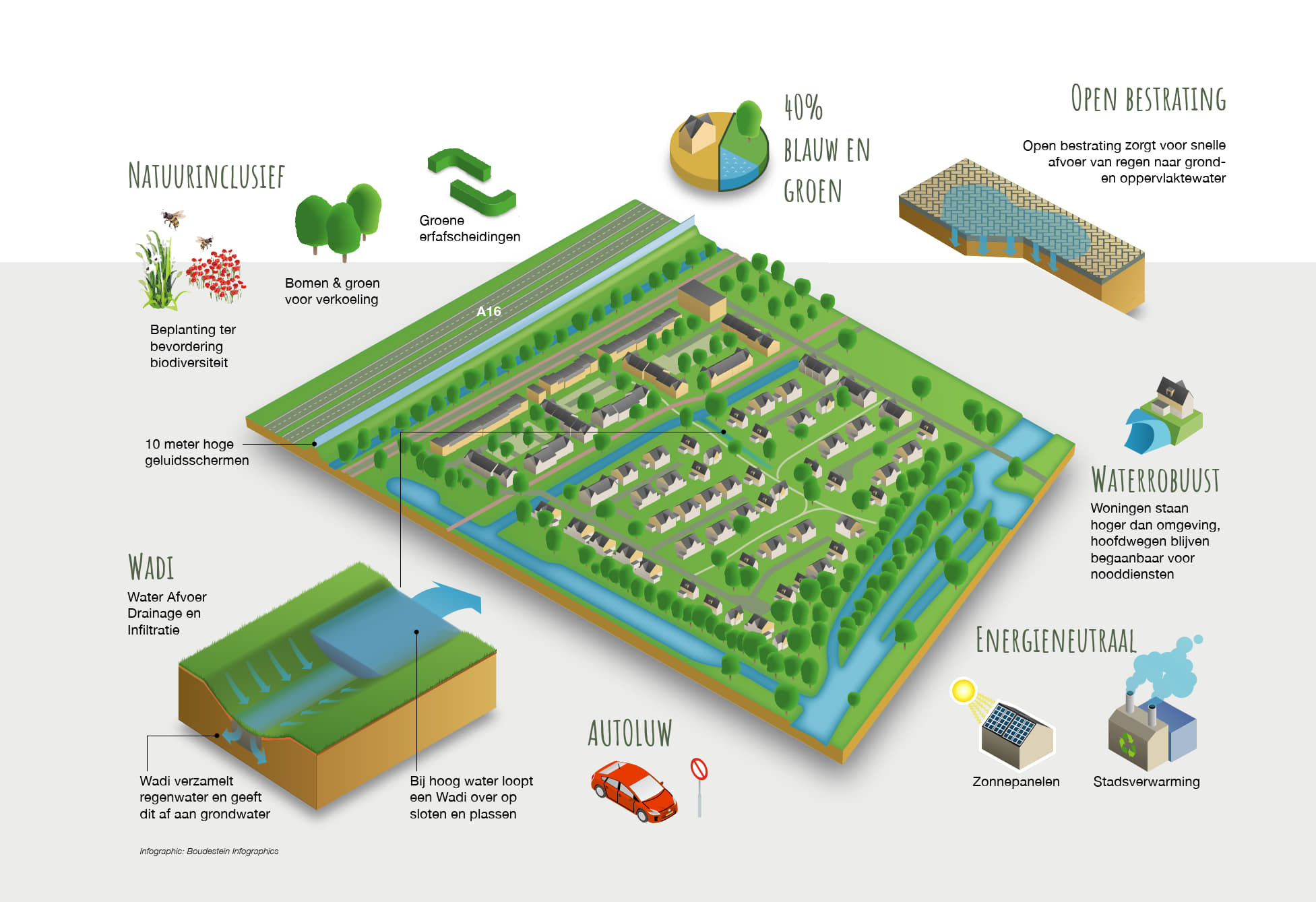 In Amstelwijck Park gaan we een stap verder op het gebied van duurzaamheid dan vergelijkbare nieuwbouwprojecten. Bij de ontwikkeling is de toekomstvisie als uitgangspunt genomen. Om te komen tot een duurzaam plan is landschapsarchitect ECHO Urban Design ingeschakeld. Op basis van hun plan is eerst het historische landschap in ere hersteld en is daarop het verdere nieuwbouwplan gebaseerd. Door klimaatadaptieve maatregelen past de leefomgeving zich aan aan het veranderende klimaat (extreme regenbuien en zomerse hitte) en worden schadelijke gevolgen voorkomen. In onderstaande afbeelding zie je diverse klimaatadaptieve en natuurinclusieve maatregelen die we in Amstelwijck Park hebben genomen.