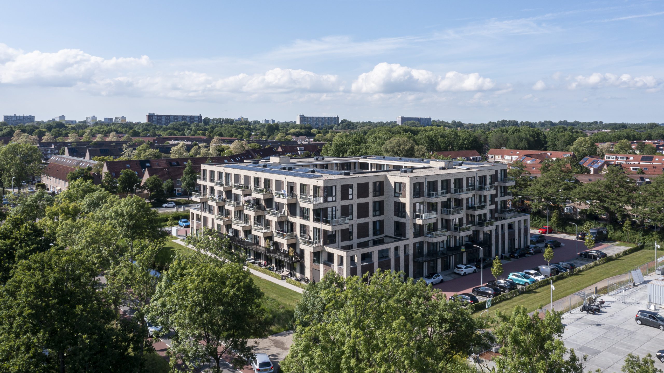 Aan de groene rand van de stad Purmerend, buiten de drukte van het centrum, hebben we Grotenhuyshof gebouwd. Een karakteristiek appartementencomplex met 89 appartementen, verdeeld over vijf woonlagen. Comfortabel, compact en duurzaam, in een omgeving met groen en water.