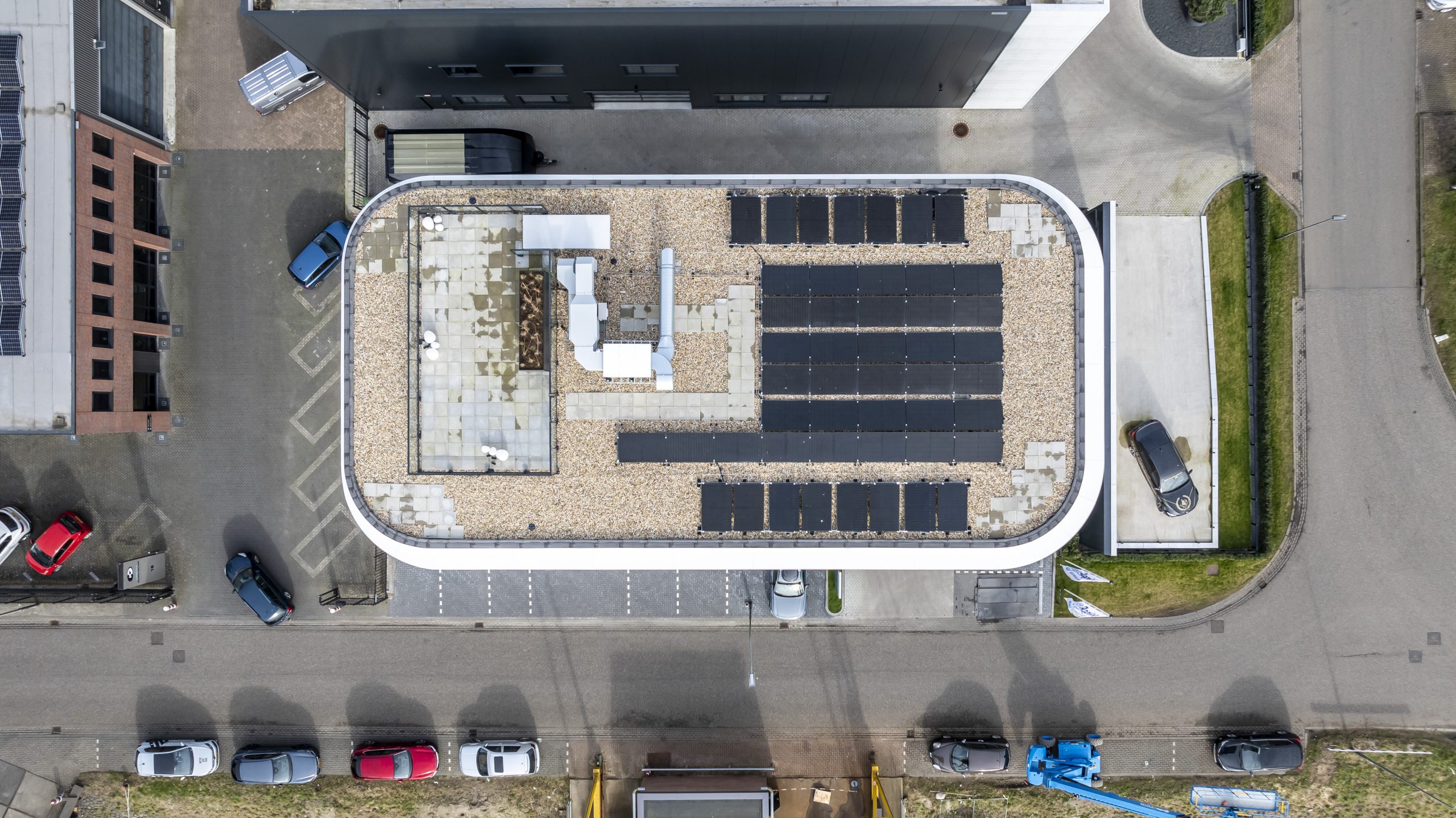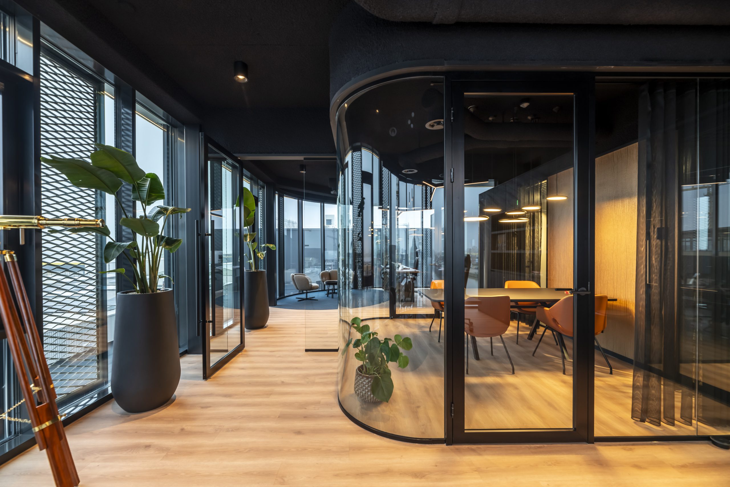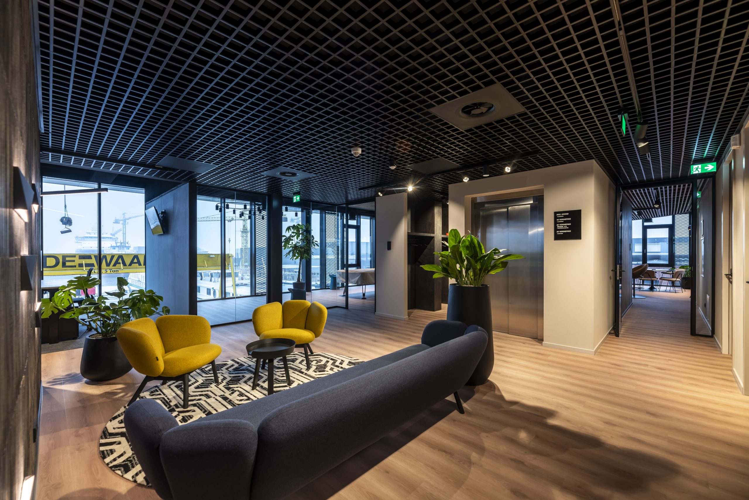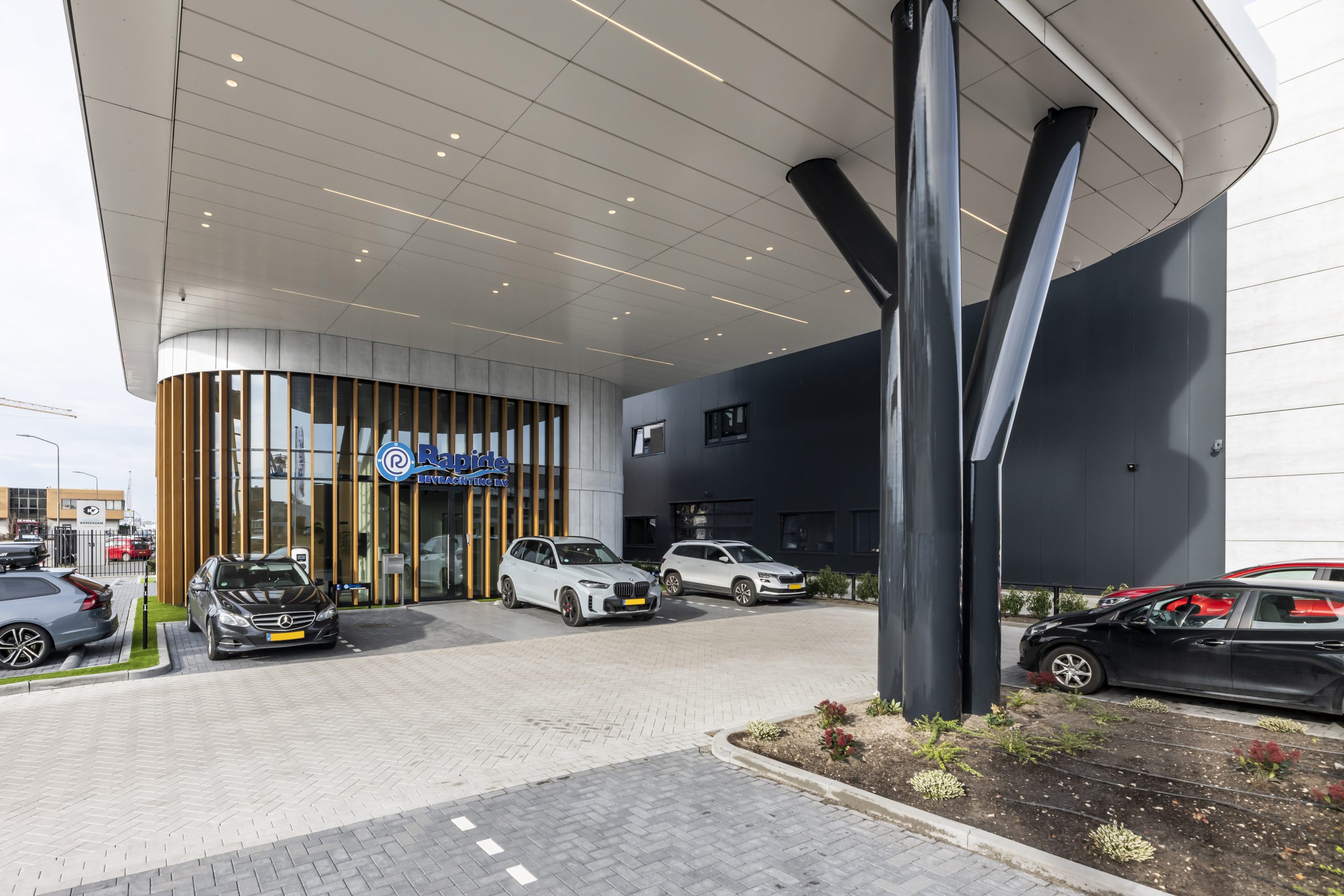 Naast veel glaswerk, is de gevel voorzien van strekmetalen roosters in goudkleurige verf gegoten. Deze roosters dienen als decoratie. Op de begane grond zijn er verticale aluminium lamellen met een houtlook aangebracht. Deze geven de gevel een stijlvolle en natuurlijke uitstraling. Zelfs de parkeerplaats is bijzonder. Het plafond boven de parkeerplaats is namelijk voorzien van led strips. In het donker is het pand ook goed zichtbaar; er zijn verschillende luifels voorzien van led strips.